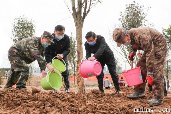 一下车,省领导就纷纷抓起铁锹,走向植树点,同在场的干部、官兵和群众相互协作,一起挖坑、扶苗、培土、夯苗、浇水,忙碌起来,现场一派热火朝天的劳动景象。当天上午,大家在20余亩绿化地块上,共植下碧桃、红叶石楠、丹桂、李子等树苗300余株,为八闽大地增添了一片新绿。