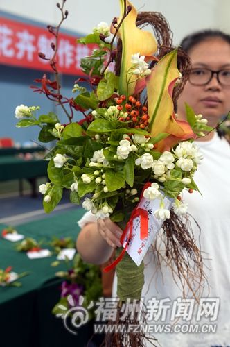 这束名为《榕韵》的捧花获得捧花类一等奖。 昨日,第一届全国青运会“礼仪花卉”制作技能比赛在福州淮安会议中心网球场举办,152位选手带着357件作品参赛,评委们现场选出了头饰花冠、项饰、手串、捧花、盆景插花等几类礼仪用花的一、二、三等奖作品。 昨日的比赛现场花香四溢,茉莉花香味最浓,在赛场外都能闻到。357件“礼仪花卉”作品夺人眼球,有头饰花冠、项饰、手串、捧花、盆景插花等五大类,以及香包和胸佩两小类。许多作品创意十足,有人将几朵茉莉花“镶嵌”在金属发簪上,做成茉莉花金簪,还有人将一朵朵茉莉花用细铁丝串起来做成花束。 白马河公园管理处绿化科科长邱昭辉制作的捧花《榕韵》获得捧花类一等奖。这束捧花的特色是将茉莉花和榕须艺术地融合在一起,极具福州特色 |