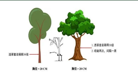 施用时,把【透翠蛀干害虫套装】每套兑水15公斤喷洒树干。