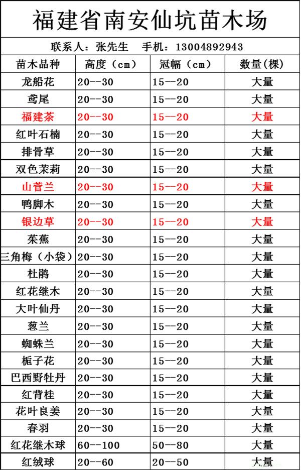 下面由闽南花木网小编介绍下福建省南安仙坑苗木场近期主要苗木: