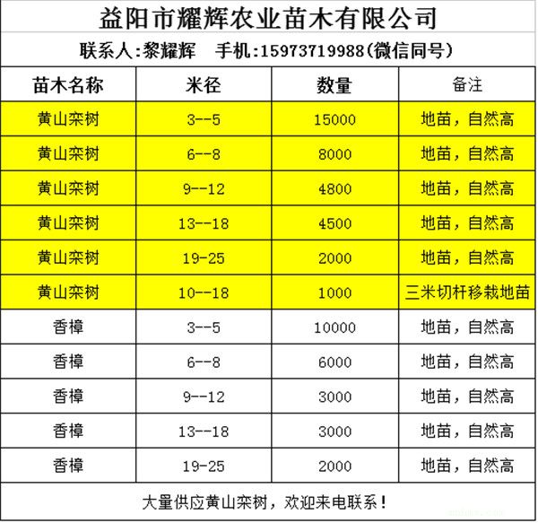 下面由闽南花木网小编介绍下益阳市耀辉农业苗木有限公司近期主要苗木(黄色为主推产品):