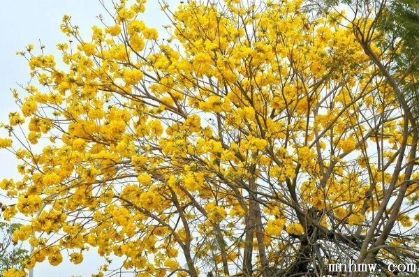 在每年春季新叶刚萌发时,黄花风铃木容易受到叶斑病等侵害。叶斑病防治,可使用70%甲基托布津粉剂800倍+黄叶一喷绿每包15克加水15-20千克,或80%代森锰锌可湿性粉剂600倍液+黄叶一喷绿每包15克加水15-20千克,交替喷施防治;虫害可使用菊酯类农药防治,如10%氯氰菊酯乳油2000倍液,或90%万灵可湿性粉剂2000-3000倍液交替喷施防治,每7-10d喷药1次,连喷3-4次即能起到良好的防治效果。