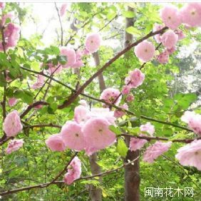 普贤象樱花:为蔷薇科樱桃属,重瓣樱花品种。花期3月下旬或4月初,花叶同开。与怨厣秸较为相似,普贤象樱花的花苞初开时是粉红色的,但等到全开时会变成粉白色,花梗弯曲下垂。重瓣樱花以普贤象樱花的花期更晚,四月中旬才进入盛开时期,它的花瓣数量更多,达到20~50枚之多。花芯伸出2片由雌蕊叶化而成的绿叶。由于化叶过的雌蕊,像普贤菩萨所骑的象,亦突出两支象牙,故起名普贤象樱花。