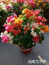 造型多样三角梅,多花多色三角梅的叶子和花属木质藤本状灌木,茎有弯刺,并密生绒毛。单叶互生,花很细小,黄绿色,三朵聚生于三片红苞中,外围的红苞片大而美丽,有鲜红色、橙色、乳白色等,被误认为是花瓣,因其形状似叶,故称其为叶子花。花期可从11月起至第二年6月 |