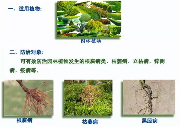 本品对由镰刀菌、立枯丝核菌、疫霉菌等病原物引起的植物根腐病类、枯萎病、黄萎 病、立枯病、猝倒病、黑胫病、疫病等效果显著,并有改变土壤微生态环境、促 进植物生长发育的明显作用。