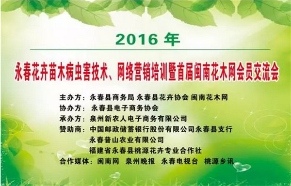 热烈庆祝于2016年12月22日下午在永春荣誉酒店举办的“2016年永春花卉苗木病虫害技术、网络营销培训 暨首届闽南花木网会员交流会”取得圆满的成功。