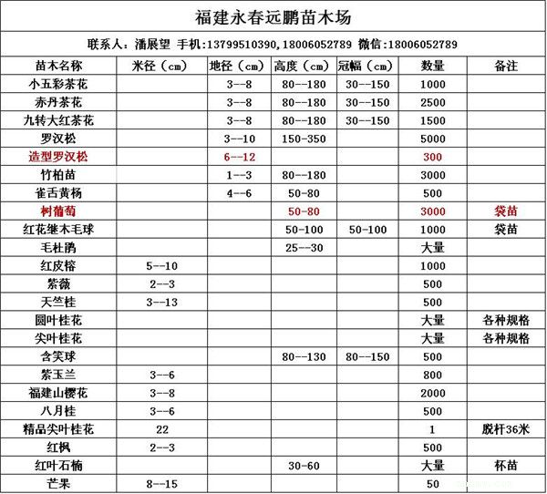 下面由闽南花木网小编介绍下福建永春远鹏苗木场近期主要苗木: