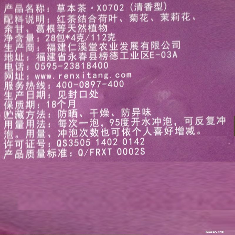 仁溪堂草本茶x0702(清香型) 产品类型:草本茶 净含量:4克*28包/112克装) 配料:红茶结合荷叶、菊花、茉莉花、余甘、葛根等天然植物 贮存条件:防嗮、干燥、防异味 产品标准代号:q/frxt 0002s 保质期:18个月 生产日期:见包装物封口处 产地:福建省泉州市食品生产许可证编号:qs3505 1402 0142 制造商:福建仁溪堂农业发展有限公司地址: 泉州市永春县榜德工业区e-03a号,饮用方法:建议用300-500ml的玻璃材质泡具,内置玻璃或者不锈钢过滤胆。以山泉水为佳,温度以90-95度为宜,可根据个人浓淡喜好选择冲泡次数及浸泡时间。特色茶浓郁,可多次冲饮,常喝有利于防止亚健康。