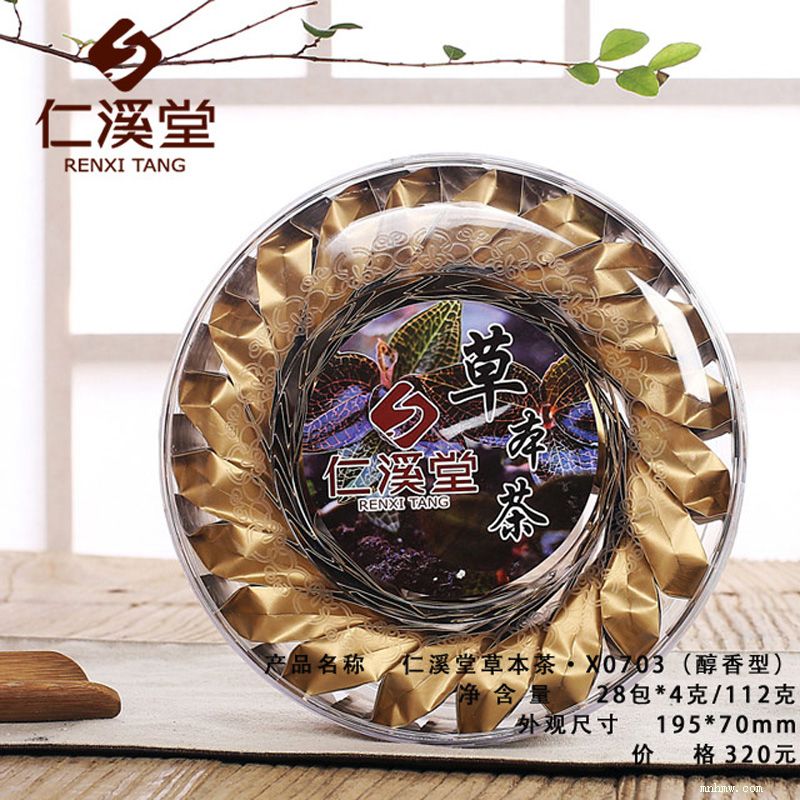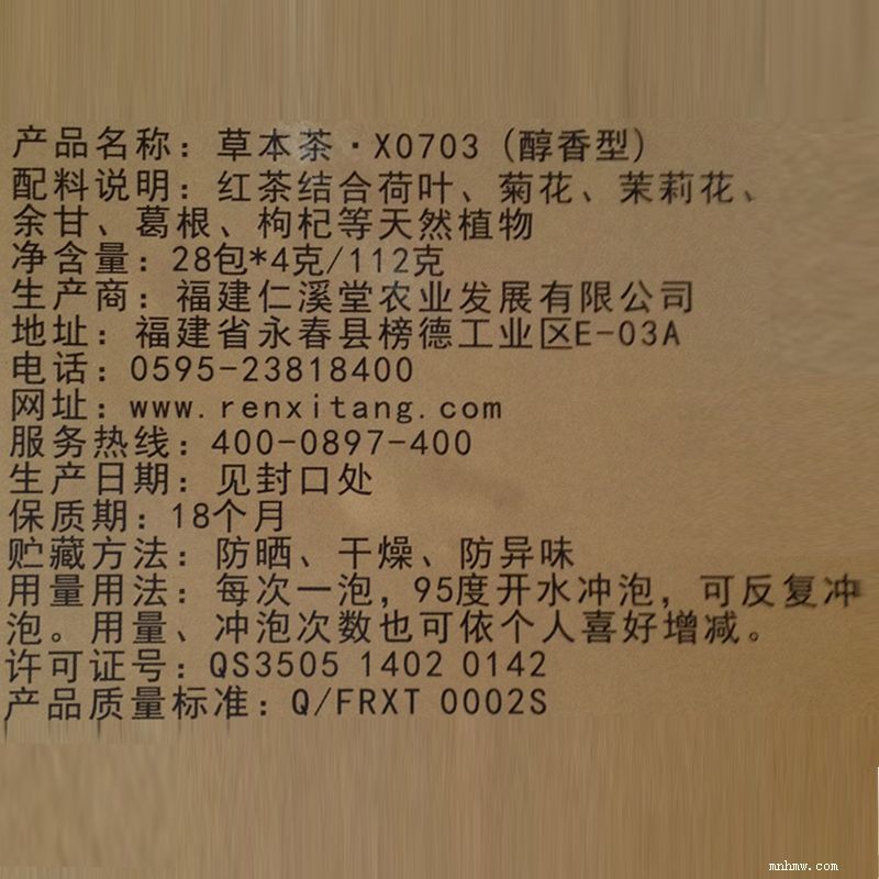 仁溪堂草本茶x0703(醇香型) 产品类型:草本茶 净含量:4克*28包/112克装) 配料:红茶结合荷叶、菊花、茉莉花、余甘、葛根、枸杞等天然植物 贮存条件:防嗮、干燥、防异味 产品标准代号:q/frxt 0002s 保质期:18个月 生产日期:见包装物封口处 产地:福建省泉州市食品生产许可证编号:qs3505 1402 0142 制造商:福建仁溪堂农业发展有限公司地址: 泉州市永春县榜德工业区e-03a号 饮用方法:建议用300-500ml的玻璃材质泡具,内置玻璃或者不锈钢过滤胆。以山泉水为佳,温度以90-95度为宜,可根据个人浓淡喜好选择冲泡次数及浸泡时间。特色茶浓郁,可多次冲饮,常喝有利于防止亚健康。