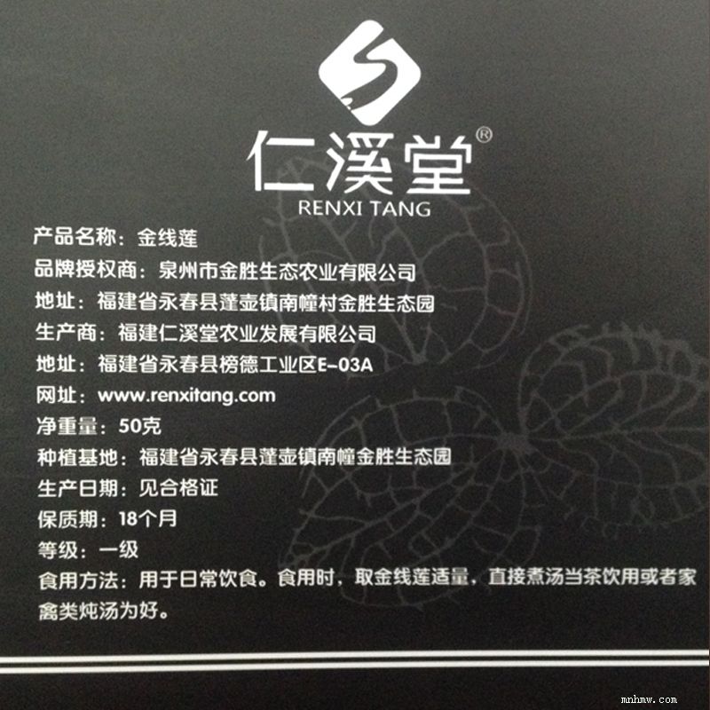 仁溪堂金线莲干品r0501精选优级50克福建礼盒装 炖泡煮通用 产品类型:普通型 净含量:50克装 配料:金线莲干品精选优级贮存条件:干燥、防异味 产品标准代号:q/frxt 0002s 保质期:18个月 生产日期:见包装物封口处 产地:福建省泉州市食品生产许可证编号:qs3505 1402 0142 制造商:福建仁溪堂农业发展有限公司地址: 泉州市永春县榜德工业区e-03a号,食用方法:(1)可煮:煮水当茶喝。(2)可炖:可与鸡、排骨、鲍鱼、蛇、水鸭、甲鱼等炖煮,当药膳。(3)可泡:保温杯加沸水侵泡30分钟左右。 可煮可炖可泡,可煮泡多次直至汤色无色即可(切勿浪费)。