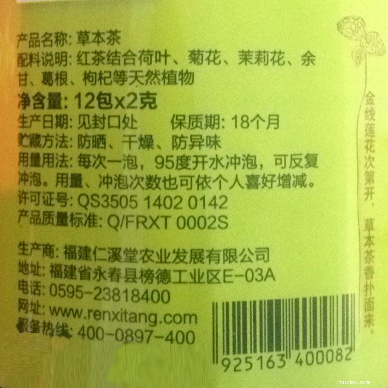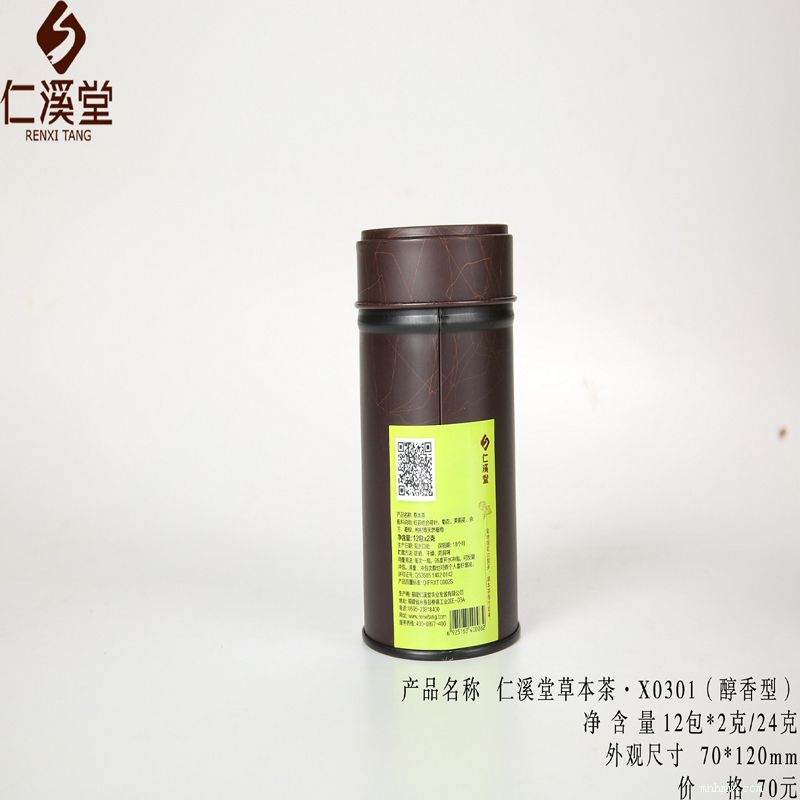 仁溪堂草本茶x0303(醇香型) 产品类型:草本茶 净含量:2克*12包/24克装) 配料:红茶结合荷叶、菊花、茉莉花、余甘、葛根、枸杞等天然植物 贮存条件:防嗮、干燥、防异味 产品标准代号:q/frxt 0002s 保质期:18个月 生产日期:见包装物封口处 产地:福建省泉州市食品生产许可证编号:qs3505 1402 0142 制造商:福建仁溪堂农业发展有限公司地址: 泉州市永春县榜德工业区e-03a号 饮用方法:建议用300-500ml的玻璃材质泡具,内置玻璃或者不锈钢过滤胆。以山泉水为佳,温度以90-95度为宜,可根据个人浓淡喜好选择冲泡次数及浸泡时间。特色茶浓郁,可多次冲饮,常喝有利于防止亚健康。