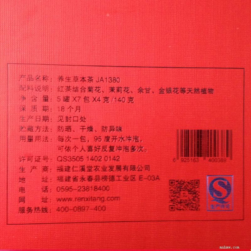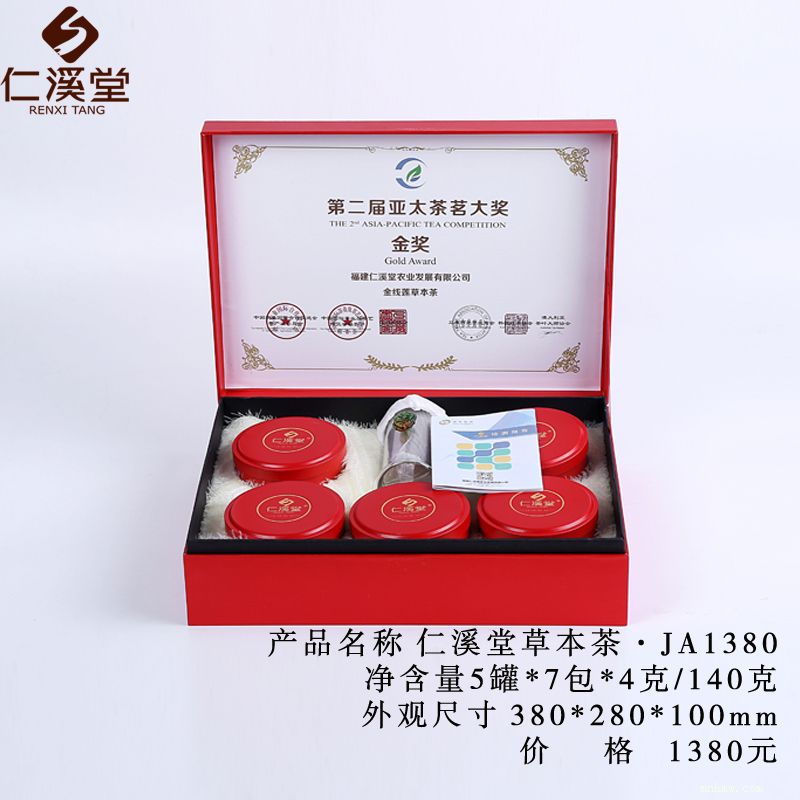 仁溪堂草本茶ja1380(浓香型) 产品类型:草本茶 净含量:4克*35包/140克装) 配料:红茶结合荷叶、菊花、茉莉花、余甘、金银花等天然植物 贮存条件:防嗮、干燥、防异味 产品标准代号:q/frxt 0002s 保质期:18个月 生产日期:见包装物封口处 产地:福建省泉州市食品生产许可证编号:qs3505 1402 0142 制造商:福建仁溪堂农业发展有限公司地址: 泉州市永春县榜德工业区e-03a号 饮用方法:建议用300-500ml的玻璃材质泡具,内置玻璃或者不锈钢过滤胆。以山泉水为佳,温度以90-95度为宜,可根据个人浓淡喜好选择冲泡次数及浸泡时间。特色茶浓郁,可多次冲饮,常喝有利于防止亚健康。