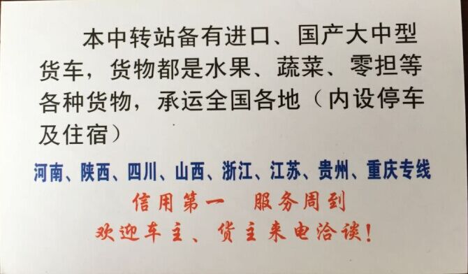本中转站备有进口、国产大中型货车,货物都是水果、蔬菜、零担等各种货物,承运全国各地(内设停车及住宿) 河南、陕西、四川、山西、浙江、江苏、贵州、重庆专线 信用第一,服务周到,欢迎车主、货主来电洽谈!!