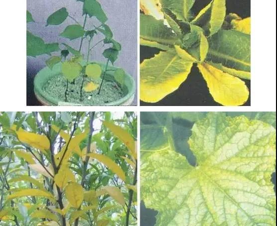 ① 苗木缺氮时,细胞变小,整株生育不良。叶子从下部开始变淡绿至黄绿,逐渐蔓延到上部。见到苗木叶片淡黄绿色、黄绿色,根也发育不良。