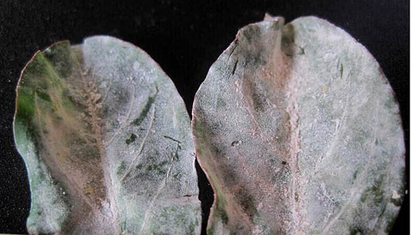 图3.紫薇受害叶片上布满白色粉末(病菌孢子)