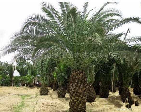| 福建中东海枣,别名:银海枣,是一种原产地在中东地区印度、缅甸的树种,属热带植物,引进中国后,福建、台湾成为其主要分布地区。中东海枣一般高达雄伟,形态优美,树干较为粗壮,叶子一般生长在树顶且较为茂盛,是一种具有明显中东特色的热带植物,在我国也深受欢迎是较为普遍的景观树种之一。