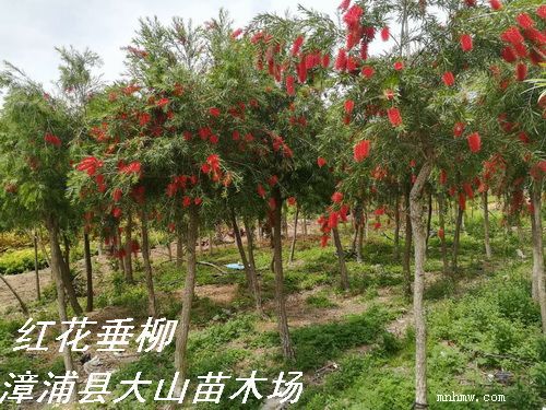 | 红花垂柳 它的树形和枝条,酷似柳树,花穗整串,故又名“串钱柳”、“红花柳”“瓶刷子”、“红千层”(其实“红千层”是另外一个品种)。本种红花垂柳学名:callistemon viminalis 桃金娘科,红千层属,穗状花序,常绿小乔木。 目前种植地区:在福建、湖南长沙、四川德阳、绵阳、成都、重庆、昆明、浙江等地种植,表现很好。
