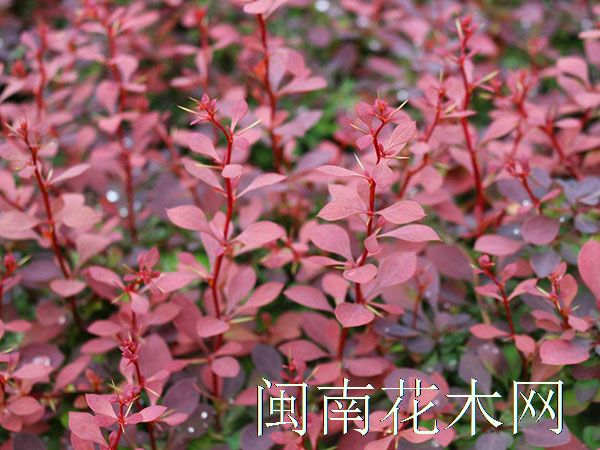 紫叶小檗别名:红叶小檗,小檗科、小檗属.原产于中国东北南部、华北及秦岭.多生于海拔1000米左右的林缘或疏林空地.落叶灌木,枝丛生,幼枝紫红色或暗红色,老枝灰棕色或紫褐色.叶小全缘,菱形或倒卵,紫红到鲜红,叶背色稍淡.4月开花,花黄色.果实椭圆形,果熟后艳红美丽.