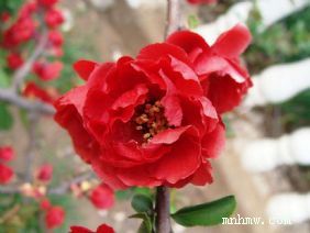 5、木瓜海棠---落叶小乔木,枝有小针刺或无刺,多枝杈,灰褐色,叶子卵形,顶端钝或微尖边缘,有圆锯齿,花朵簇萼柄粗短,花有红、橙、白、粉、绿、黄、朱砂等重瓣。部分品种花后结球形果或梨型果,成熟后香气宜人,果色浅黄或艳红,味酸,先花后叶,可谓集观蕾观花赏果,食用药用为一体的高档树种。实属园林绿化中新秀,即可作美化公园、家庭院落、街道、广场绿化的优秀观赏树种,又是作盆景的高档佳品。品种有长寿冠、银长寿、世界一、复色、东洋锦、大富贵等。